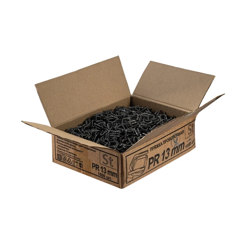 Металлическая пряжка изготовлена из гнутой пружинной проволоки круглого или овального сечения. Ключевой параметр — ширина рамки в самом широком месте — 13 мм. Это стандартный, универсальный размер для лент ПП и ПЭТ шириной 12 мм.